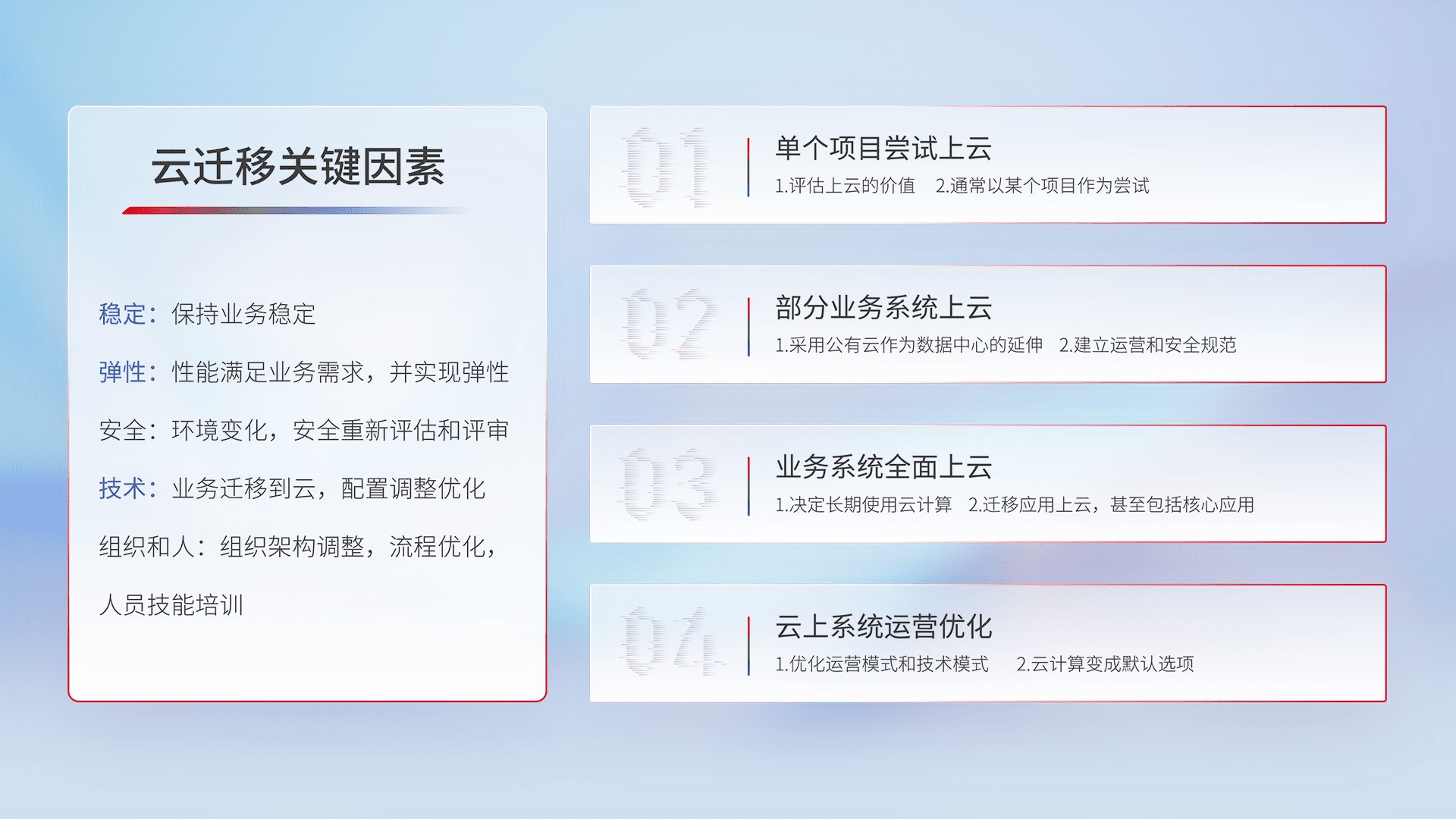 结合实际业务,,,从规划设计、、云平台选型、、、、云原生改造、、、数据迁移、、集成交付,,,迁移全过程为客户识别最佳上云路径,,做好风险识别管理,,设计网络架构、、、、身份权限、、、、安全审计合规、、操作审计、、、、日志审计、、、监控告警策略、、多站点容灾设计等,,,对云上基础设施进行整体规划,,,,提升IT治理水平,,以满足弹性、、高可用、、、、高性能的需求。。。。