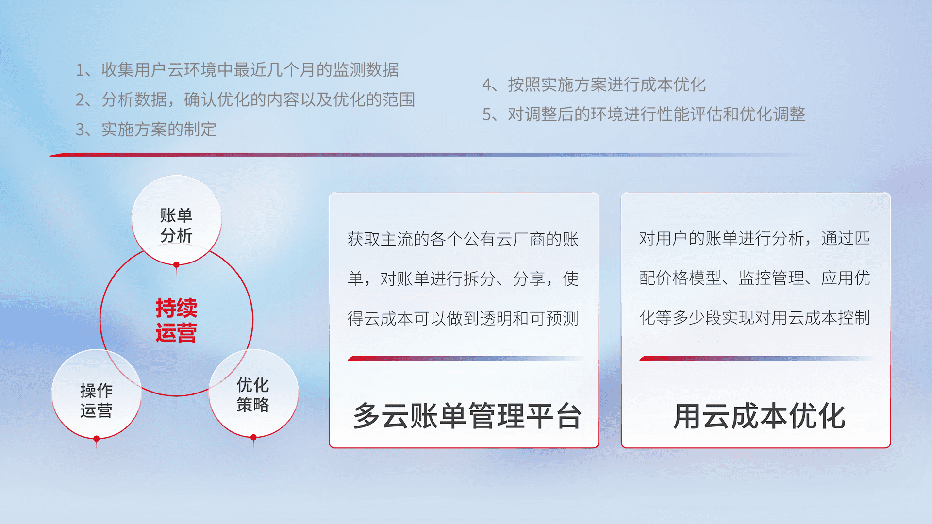 通过多云纳管,,,,以统一的资源数据模型把客户的云资源进行抽象和封装,,进而实现对多云资源的统一操作,,保障云资源管理的可靠性、、稳定性与可用性。。。量身定制化运维内容,,,,配置、、开发运维、、、补丁管理、、、备份、、监控、、、、认证和访问管理、、审计和日常巡检等,,,,保障在用云过程中的可靠度,,稳定度以及高可用率。。。。